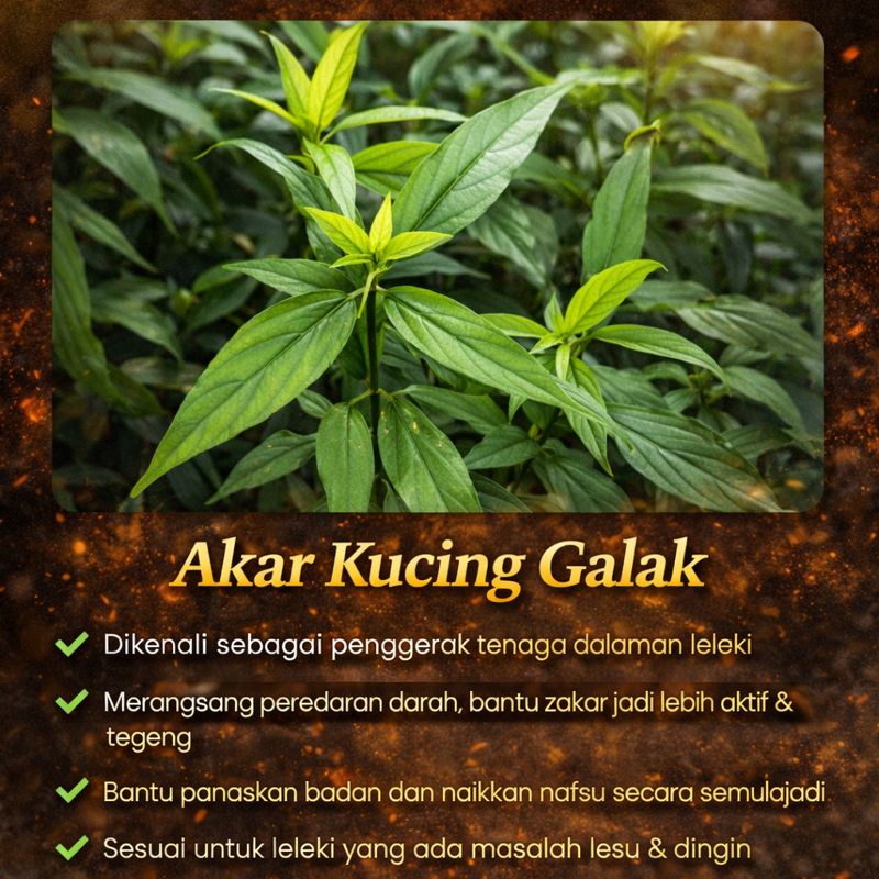 Mengandungi herba terpilih seperti Tongkat Ali, yang telah banyak dikaji oleh pakar & penyelidik antarabangsa untuk sokongan tenaga lelaki dan prestasi dalaman.